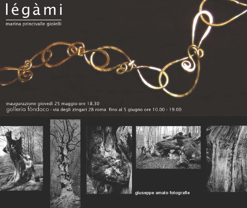 LÉGÀMI è il tema della mostra di sculture da indossare che Marina Princivalle presenta per la prima volta nello spazio galleria fòndaco. Catene realizzate in argento scolpito da comporre che accompagnano i bronzi, gli argenti, le pietre e i suoi piccoli quadri-gioiello che da sempre realizza e espone in occasioni mirate e costruite con grande attenzione ai dettagli e alla presentazione. Le accompagna la magia dei boschi dell’Abruzzo nelle immagini di Giuseppe Amato che raccontano di radici, nodi, rami, tronchi, trame e intrecci.