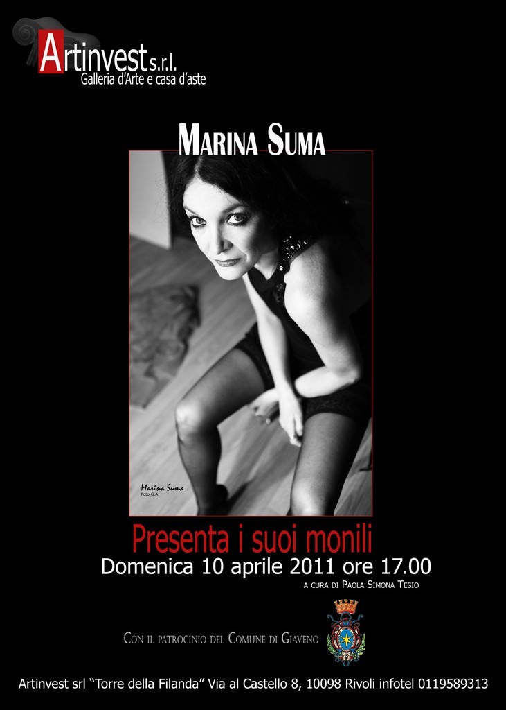 Artinvest "Torre della Filanda" avrà l'onore di invitare la bellissima attrice Marina Suma per una giornata d'eccezione che si terrà domenica 10 aprile 2011 , con inaugurazione e sfilata alle 17. Evento patrocinato dalla Città di Giaveno, con la presenza dell'Amministrazione Comunale. In quest'occasione verrà organizzata una sfilata dove alcune modelle indosseranno originali monili artistici, della linea Leni, creazioni uniche da lei appositamente ideate. Come sottolinea il direttore della galleria Roberto Girardi «si tratta di opere d'arte, ricche di materia e suggestioni in cui si evince un equilibrio di figure e colori. Questi gioielli, plasmati a mano ad uno ad uno, sono come pitture, che meritano di essere esposte. Abbiamo pensato di ricorrere a delle indossatrici per esaltarne la particolare versatilità e la pregevole e raffinatezza estetica». Marina Suma forgia con creatività la cartapesta che dipinge in modo sublime attraverso tinte vivaci e tenui che si stagliano su stratificazioni di materiali, come lei stessa precisa «ho sempre nutrito un amore incondizionato per l'arte ed è un sentimento che sin da piccola mi è stato insegnato da mio padre. Quattro anni fa è nata in me l'idea di realizzare dei gioielli, per esaltare la bellezza della donne e far sì che il loro fascino possa suscitare ammirazione negli uomini. Quando ideo questi monili cerco il contatto con la natura, i colori del mare, del cielo, l'armonia della montagna. Queste sensazioni non possono che riflettersi sui cromatismi e sulle forme». Collane, bracciali, orecchini dalle sagome peculiari dominate da campiture in grado di trasmettere positive emozioni che accrescono l'eleganza, la femminilità e la sensualità. Durante la serata di domenica 10 aprile i monili artistici saranno messi in vendita ed il pubblico potrà inoltre incontrare l'attrice che presenzierà a questo impedibile appuntamento. I prezzi di questi gioielli sono alla portata di tutti: orecchini da 30 a 40 euro, bracciali 40 euro, collane da 50 a 150 euro. Ad arricchire la manifestazione saranno esposte alcune immagini del giavenese Simone Ostorero, promettente fotografo capace di rendere i soggetti fotografati unici ed originali.