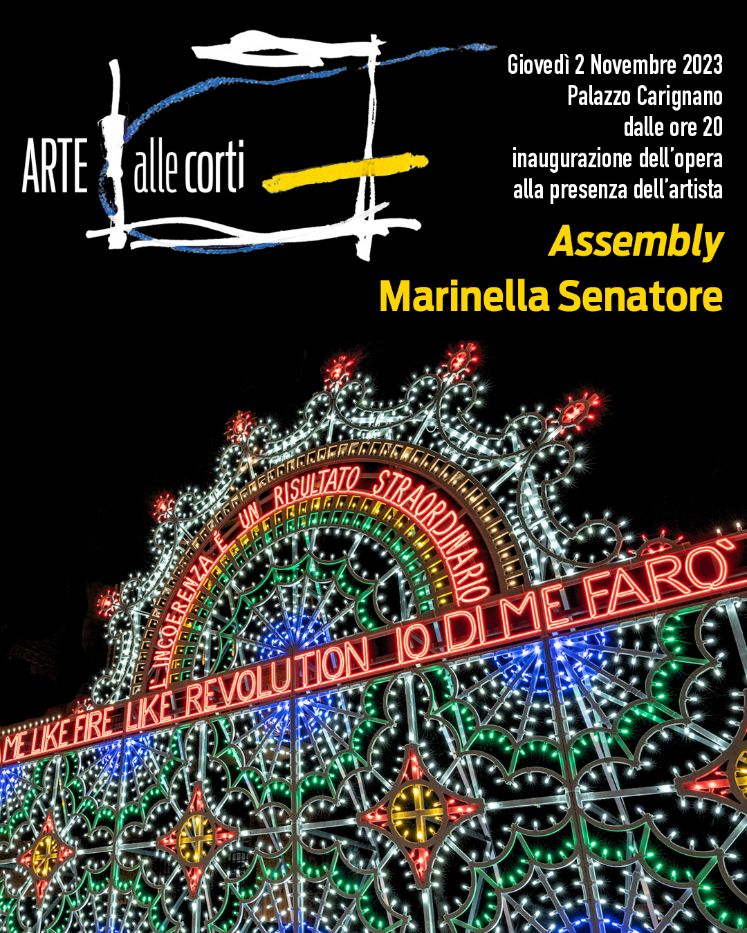 “In linea con lo spirito di festa e di celebrazione collettiva di Arte alle Corti, che promuove e valorizza le bellezze cittadine attraverso e in dialogo con l’arte contemporanea, con l’accensione di questa scultura di luce, Torino con i suoi cittadini e turisti entrerà a fare parte della comunità di individui coinvolti fino ad oggi nel lavoro relazionale di Marinella Senatore che conta oltre un milione di persone.” Racconta Olga Gambari, membro del comitato organizzativo di Arte alle Corti. Assembly si ispira alle tradizionali strutture architettoniche illuminate che, a partire dal XV secolo, venivano utilizzate nelle celebrazioni pubbliche all’aperto nel sud Italia e che Marinella Senatore rende “spazi relazionali” attraverso l’inserimento di citazioni legate all’empowerment e all’emancipazione. Si tratta di un’evocazione delle feste barocche che grazie agli apparati effimeri mutavano l’aspetto delle Residenze Reali e delle città sedi delle corti.