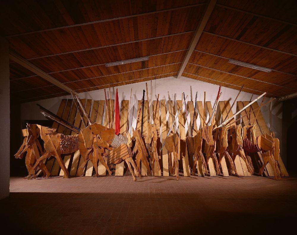 Il tema equestre è affrontato nella celebre Battaglia, un insieme di sagome di legno rappresentanti un gruppo di cavalli in atto di attaccare sovrastati da lance colorate che ricorda le celebri composizioni rinascimentali di Paolo Uccello. L’opera che per la forza che esprime rimanda ad uno dei momenti fondamentali della corsa: la mossa, sarà collocata all’interno delle Logge del Papa, a due passi da Piazza del Campo. A distanza di qualche metro, protagoniste ancora alcune figure di cavalli, all’interno della suggestiva Loggia della Mercanzia e nella piazza di San Domenico.