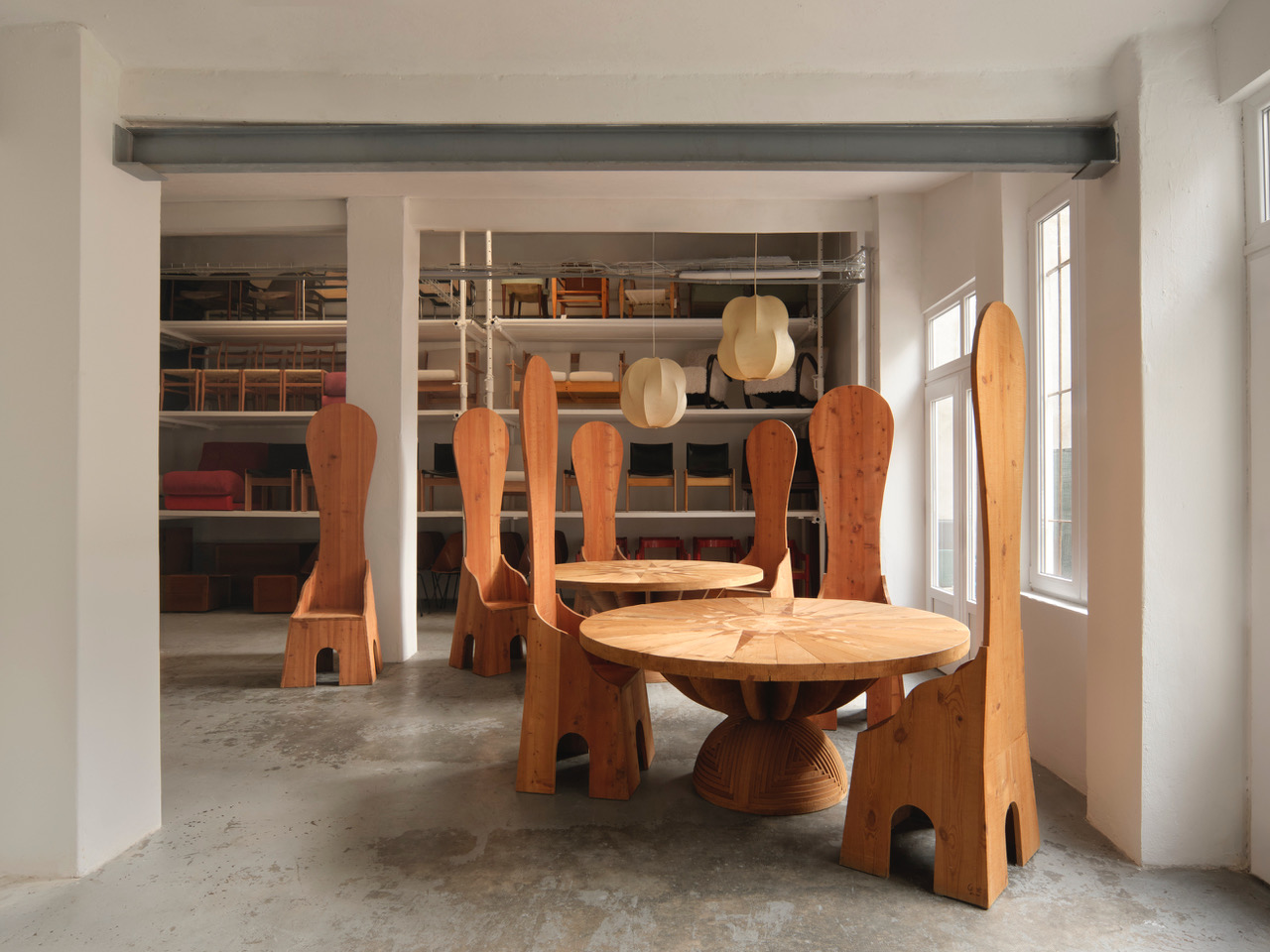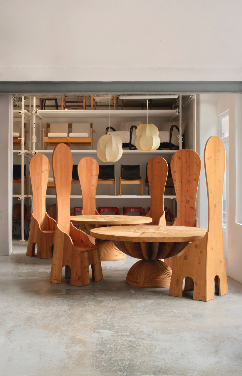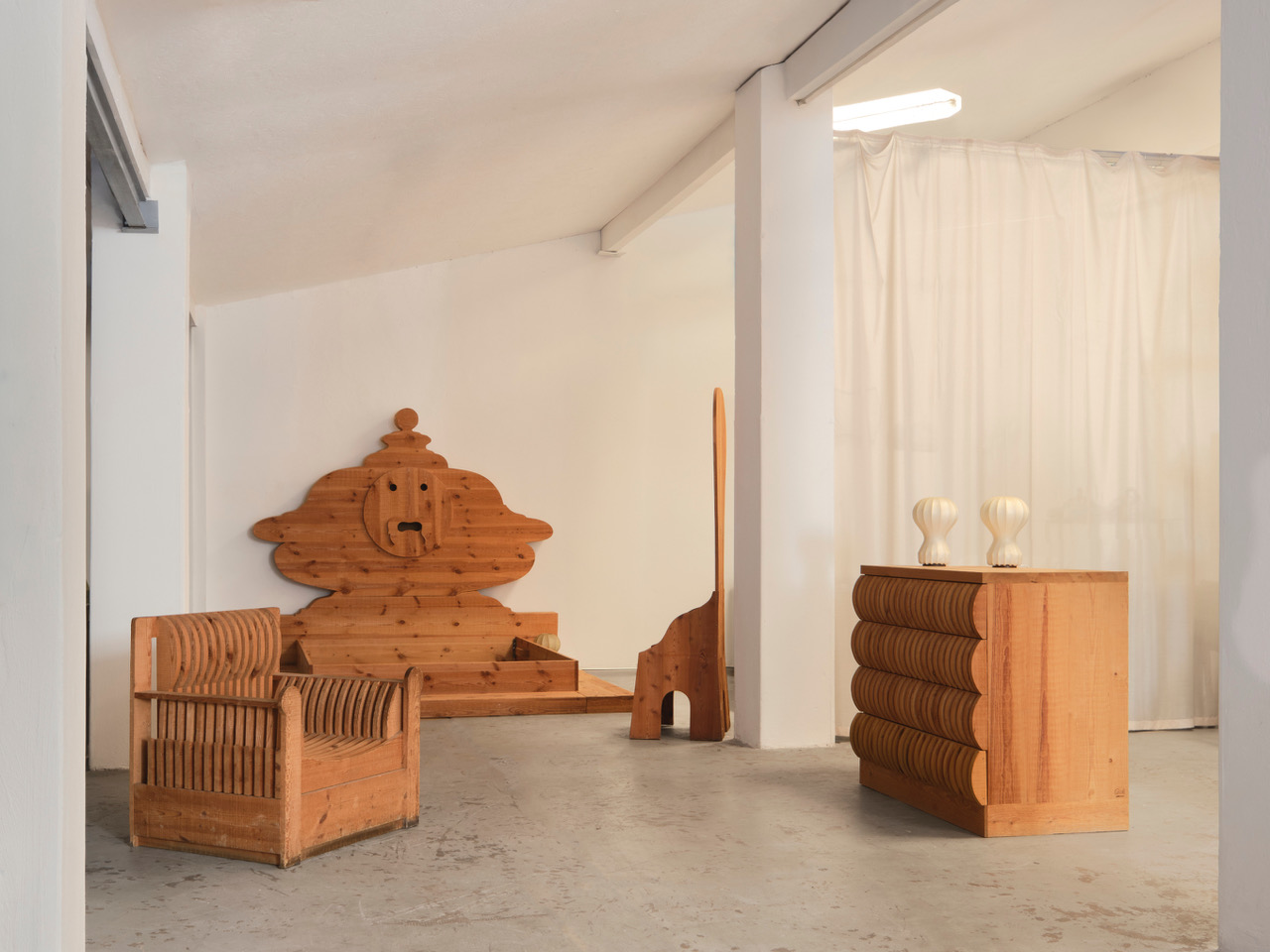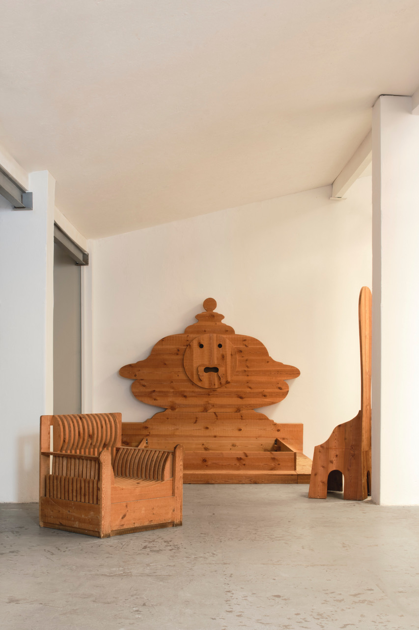 Le forme ideate da Ceroli poi giocano sul continuo richiamo all’arte antica così come alla cultura pop: sono oggetti che rimandano a un qualcosa che si conosce già, accrescendo così il senso di confusione metafisica di chi li guarda. Le sedie a spalliera sono il mobile che più ricalca l’immaginario dechirichiano, nelle loro forme allungate si possono riconoscere i manichini tanto cari al pittore greco. Ci sono poi un tavolino basso con un piano in vetro e due tavoli con una decorazione che riproduce una rosa dei venti da cui emerge una sacralità di proporzioni simile a quella del mondo classico o medievale, in cui si riconosce anche l’abilità tecnica dell’artigiano che costruisce mobili in cui la levigatura del legno e il suo perfetto incastro sono fondamentali. Infine le cassettiere, i divani e la poltrone presentano giochi di pieni e di vuoti dove la materia lignea vibra e il letto, con la sua decorazione antropomorfa, richiama i grandi arredi antichi. In mostra anche una scultura in legno che rappresenta un sole fuori dalla finestra, un gioco in cui verità e finzione si incontrano.