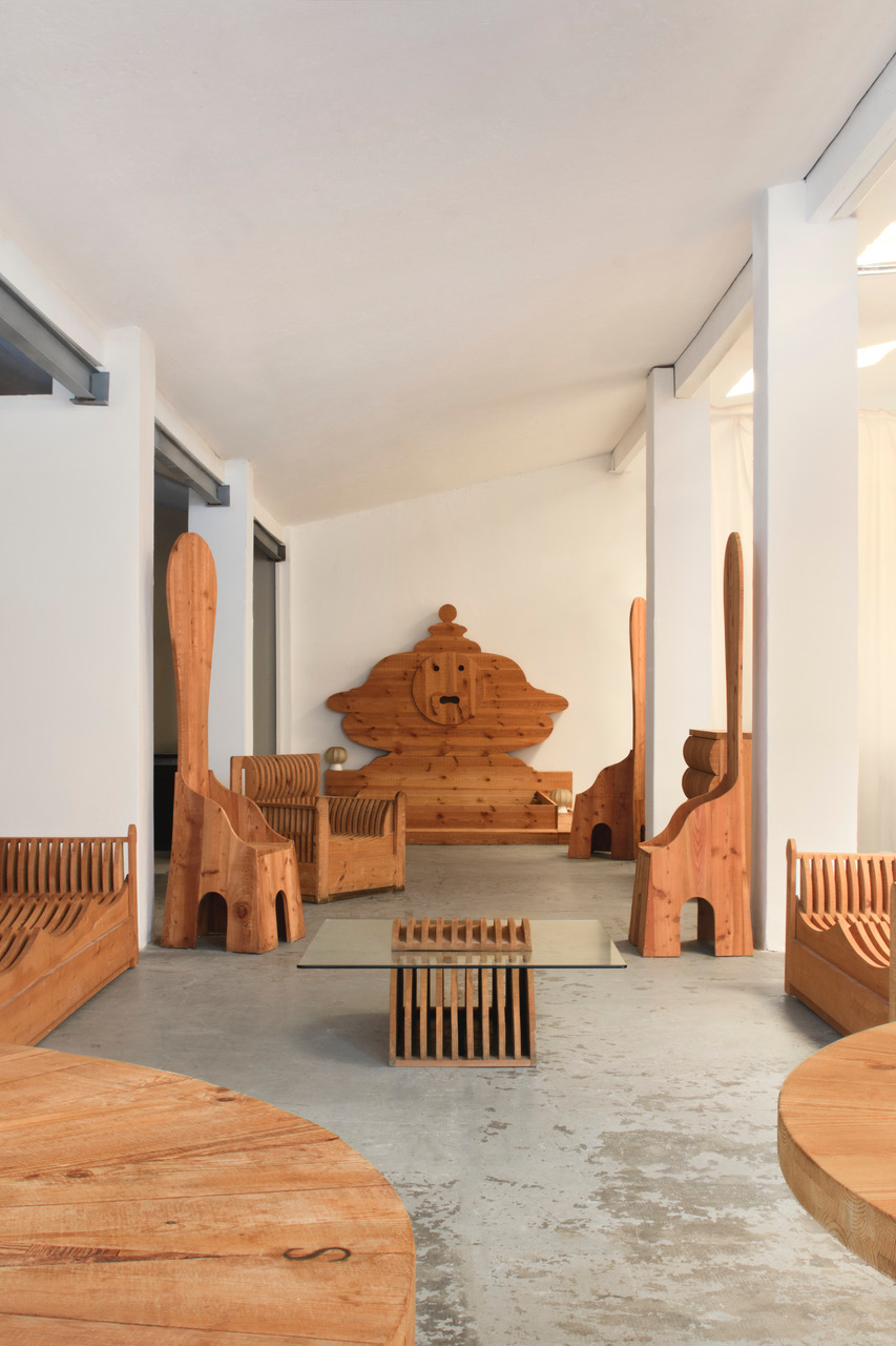 La mostra propone la ricostruzione di un ambiente con complementi di arredo a firma di Mario Ceroli, in cui il mobilio realizzato dall’artista si esprime al meglio delle sue capacità sceniche.
