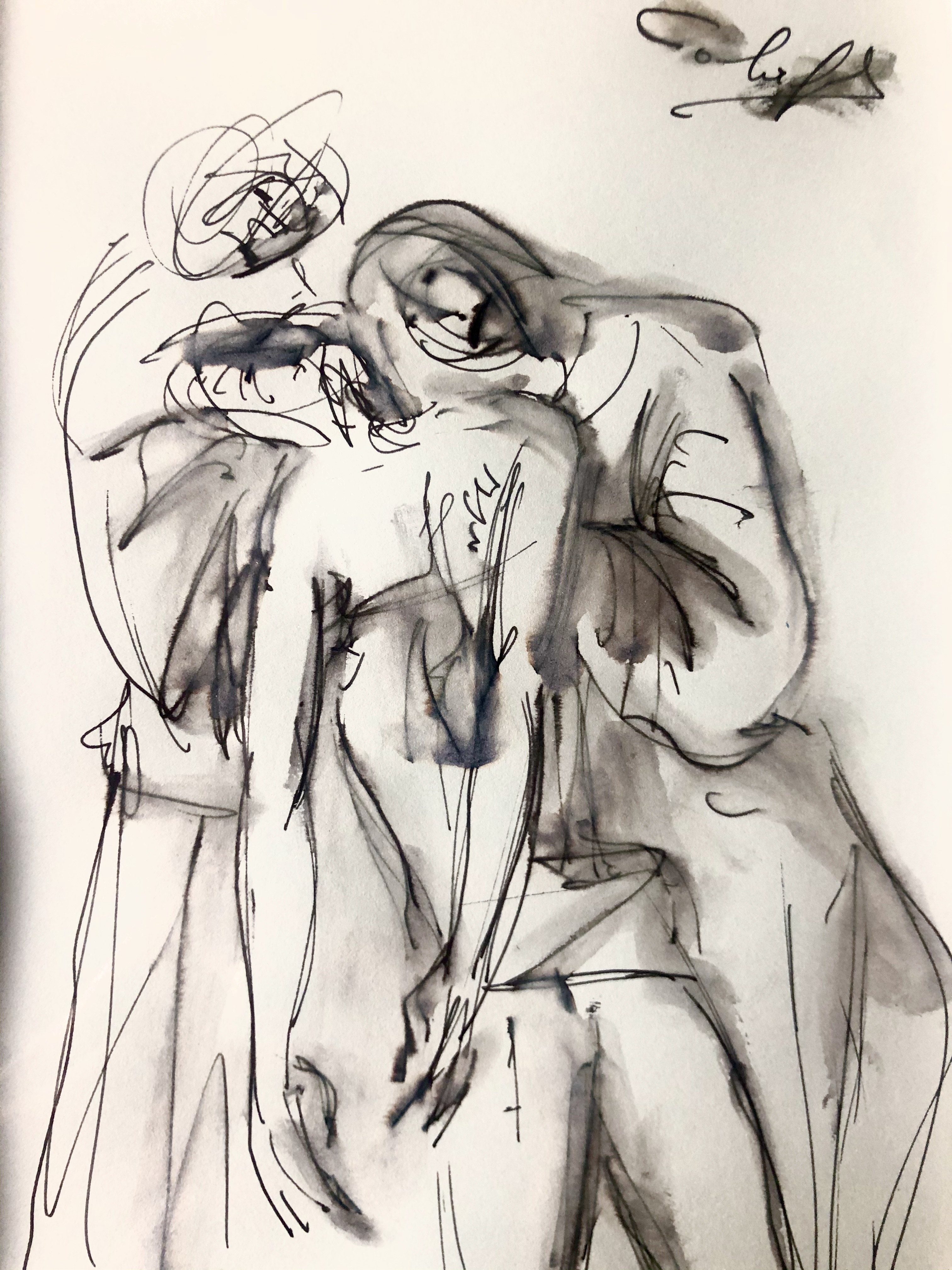 Nei disegni di Colaps, le forme di Cristo sono solo accennate: poche righe mettono in evidenza l’enigma di cui il figlio di Dio si fa veicolo e, al contempo, consentono a chi lo osserva di definire l’opera autonomamente tramite un processo intuitivo in grado di rendere l’immagine altamente comunicativa e viva, quasi come se respirasse.