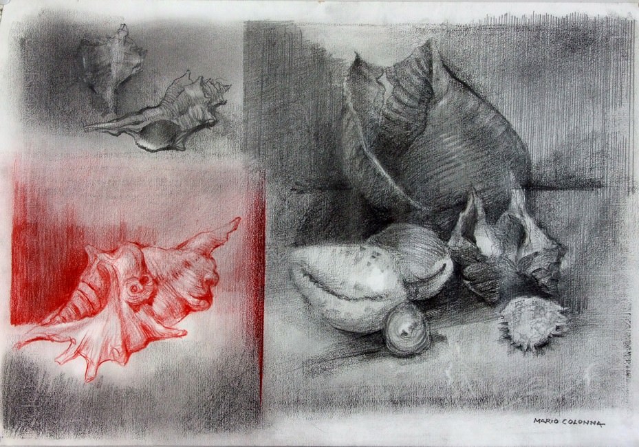 Una seconda sezione dell'esposizione è dedicata ai disegni pastellati mai usciti, come anche i lavori della terza sezione, dallo studio-grotta pieno di tesori di creatività. Il disegno, così sottovalutato se non disprezzato dalle nuove generazioni di artisti o di velleitari sedicenti tali. Non esiste in natura, né si offre alla percezione del vero, bensì traduce in conoscenza intellettuale la nozione sensoriale della realtà, opera cioè un processo di astrazione e ideazione...non a caso Heghel lo definiva come idea “ incarnata in forme sensibili” pertanto strumento principe intellettuale e concettuale perchè se – a dire di Winckelmann - “ la bellezza è percepita dai sensi, ma è la mente che la riconosce come tale e la comprende”. Sono nature morte, ma vivificate da una luce più o meno presente tra i neri profondi, le infinite variazioni di grigi e i piccoli vuoti di chiari: una oscurità che nasconde perchè poi illumini di più. Si rinnova così l'antica poesia della quotidianeità, da Chardin a Morandi, privilegiando però il farsi e il disfarsi della materia-vita sotto la luce del divenire trasfigurante e mutante.