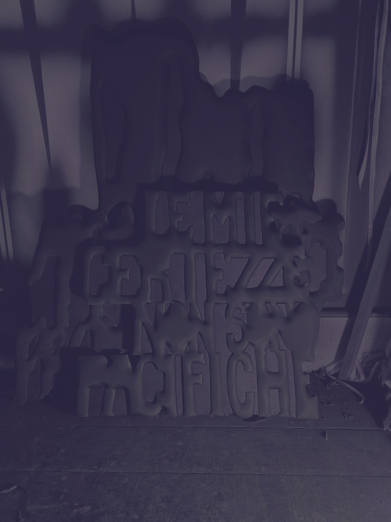Il tratteggio morbido, quasi rassicurante, delle singole lettere quasi si scontra con la scelta di una tinta total black. Ma il colore nero, foriero di messaggi funesti, diventa anche vessillo di una libertà espressiva totale, di un pensiero che corre fuori dai binari. Sulle frasi incise, dense come bitume, la luce scorre come in stoffe mosse dal vento. Sono le ombre del nostro passato sul presente, macchie d’unto indelebili sulle nostre coscienze.