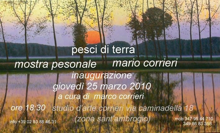 Titolo della mostra "PESCI DI TERRA", in onore alla amata Sicilia terra natìa del pittore Mario Corrieri e alla Lombardia, terra altrettanto amata in cui il pittore svolge la sua intensa attività artistica.