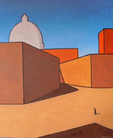 Mario D’Amico fa una pittura senza tempo. Eppure con questa pittura è capace di raccontarci il nostro tempo con precisione algebrica e con toni di struggente elegia. Il rapporto tra l’Uomo e la Città è al centro della sua indagine paziente, minuziosa, precisa eppure mai ridondante, mai retorica, capace di invenzioni poetiche e metaforiche.