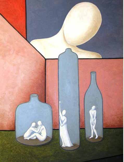 E la poetica di Mario D’Amico sa volare così liberamente per l’etere da riuscire, appunto, a darci quasi l’idea di un mondo coloristico silenzioso. L’artista, infatti ricorre su diversi piani per costruire i suoi lavori, costruisce con sistemi geometrici i suoi ambienti, che sono come una finestra aperta sopra il mondo della metafora e dell’irrisione. Un ambiente ludico della creazione pare animarlo come in una scenografia teatrale su cui incombe a volte l’idea della tragedia o della metafisicità.