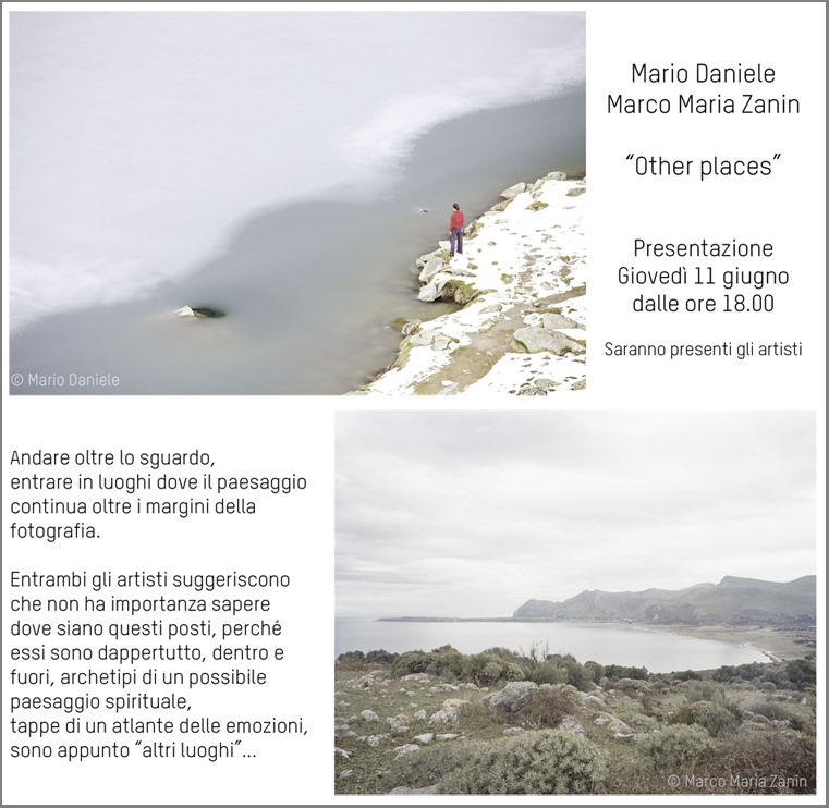 VisonQuesT Contemporary photography presenta, come ultimo progetto di fine stagione, “Other Places” di Mario Daniele e Marco Maria Zanin. I due artisti sono legati al tema del paesaggio ed entrambi, con mezzi differenti sia per tecnica sia per contenuto, affrontano questo tema “storico” della Fotografia in modo particolare e innovativo, staccandosi dagli schemi, scavando oltre quello che vediamo e facendoci entrare in luoghi dove i paesaggi continuano oltre i margini della fotografia.