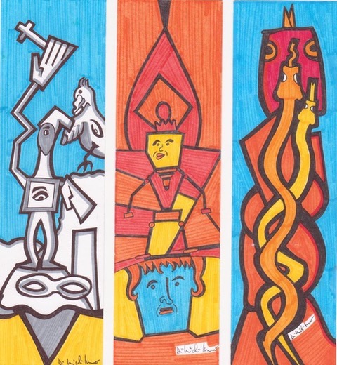 In una serie di cartoncini verticali cm. 21 x 6 sono sintetizzati i suoi originali incastri figurativi di simboli e personaggi, tutto il suo universo fantastico e pop. Una vera sfida perché la piccola dimensione verticale costringe a concentrare il proprio mondo espressivo in uno spazio essenziale