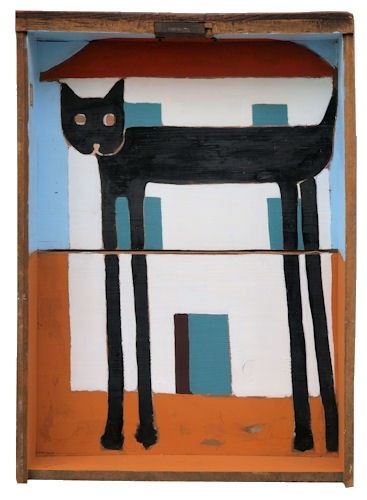 C’est l’esprit familier du lieu; / il juge, il préside, il inspire / toutes choses dans son empire; / peut être est- il fée, est- il Dieu? Con gli occhi di opale, d’argento, di agata, di particelle d’oro, amico della scienza e della voluttà… il gatto è il mistero per Baudelaire e non solo per lui; con quell’aspetto consapevole e riservato, diverso da ogni altro animale da compagnia, è stato simbolo del sacro e del demoniaco, segno di un impercettibile contatto fra il mondo quotidiano e il segreto celato dietro le cose. Gomboli non sfugge a questa sollecitazione misteriosa, anche se la sua distaccata ironia lo induce a toni assai più riservati di quelli di Baudelaire. I suoi gatti segreti, bizzarri, a volte beffardi, fanno solo capolino dietro complessi equilibri di forme, oppure si dispiegano a volte aggressivi a volte supplichevoli, a volte sornioni…. Paradigma delle umane esistenze, strette in un groviglio nel quale il disordine e l’incomprensibilità sono solo apparenti, il gatto a volte sembra, nella pittura e nelle forme polimateriche di Gomboli, il solo capace di sciogliere l’enigma o almeno di alluderne la soluzione. Fata o demonio, il gatto traversa queste immagini imprendibile e silenzioso, riporta via con sé il suo mistero, ma affascina l’osservatore e lo costringe a pensare e ripensare, ad aguzzare lo sguardo, al di là di quelle apparenze che il pittore e il gatto suo alter ego gli rivelano ingannevoli: e quel mondo segreto appare attraente e affascinante, armonico e avventuroso. Il magico nel quotidiano, come insegnavano i Romantici tedeschi e francesi, i Poeti maledetti e i mistici antichi…