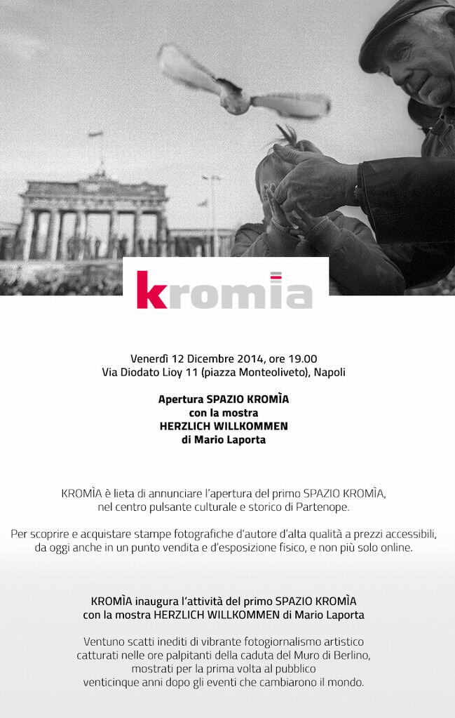 KROMÌA inaugura l’attività del primo SPAZIO KROMÌA con la mostra Herzlich Willkommen di Mario Laporta: ventuno scatti inediti di vibrante fotogiornalismo artistico catturati nelle ore palpitanti della caduta del Muro di Berlino, mostrati per la prima volta al pubblico venticinque anni dopo gli eventi che cambiarono il mondo.