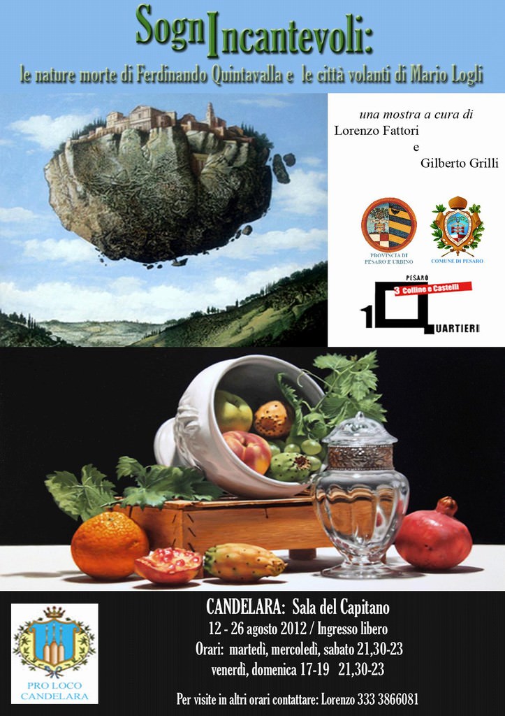 La Pro Loco di Candelara ed il Consiglio “Quartiere n. 3 delle colline e dei castelli”, con il patrocinio della Provincia di Pesaro e Urbino e del Comune di Pesaro, sono lieti di invitare la cittadinanza, gli appassionati d’arte ed i turisti all’inaugurazione della mostra pittorica “Sogni incantevoli: le città volanti di Mario Logli e le nature morte di Ferdinando Quintavalla” allestita presso la Sala del Capitano di Candelara.