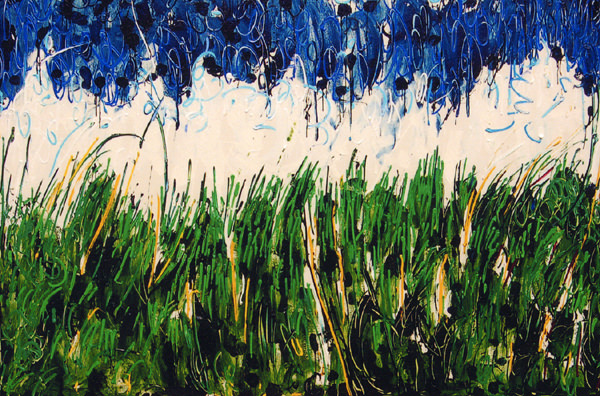 Lo spazio delle due tele di Il lungo viaggio del sole fino alla vetrata blu è conquistato attraverso un’energia interna ed una gestualità estrema, quasi violenta. I colori blu, giallo, rosso così intensi, materici e contrastanti, danno vita a straordinari effetti cromatici. Così come il bianco del cielo di Ondata immobile, solca il blu che a sua volta si intreccia con del verde, in un sovrapporsi di linee e colori in cui non esiste nessun criterio naturalistico ma dove tutto è regolato dal divenire della pittura “materia”.