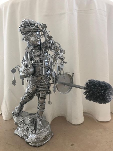 Le oltre cinquanta opere esposte nelle ampie sale del Piano Nobile di Palazzo Sanseverino-Falcone, sede del museo alle pendici della Sila Greca, sono i frutti di una creatività esuberante di un artista poliedrico dotato di un approccio ironico e originale. La sua produzione scultorea fa rivivere con leggerezza materiali di scarto, dando loro nuova vita. Originario di Pagania Vallone Cupo, terra acrese che custodisce nel cuore, Mario Sposato si avvicina al mondo dell’arte con un approccio umile e artigianale, che trova il suo sfogo creativo ideale nell’elaborazione e creazione di opere di scultura partendo da materiali di riciclo a cui dona forme e significati che testimoniano di una vena creativa rigogliosa e di una fantasia senza confini. Un procedimento artistico dotato di un primario valore etico, in un momento storico in cui il riciclo di materiali di scarto è diventato un’esigenza sempre più impellente e imprescindibile: il riuso di marionette agghindate di baffi o di arti come protesi fatte di filo di ferro; mondi, cuori, o mappe costruite con avanzi elettronici, lampade Tiffany fatte con lenti di occhiali; riuso di pupazzi o di manichini complicati da protesi di recupero in ferro nichelato o in acciaio.