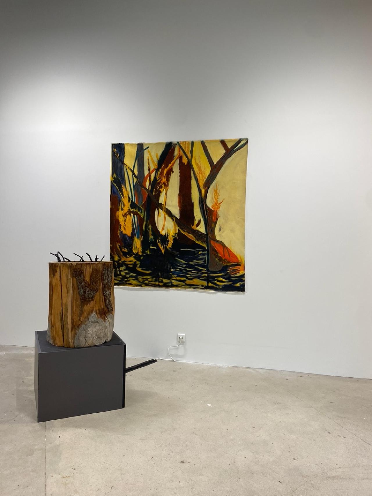 In mostra tele, tavole dipinte e disegni monocromi con alberi e boschi di materie arse, oltre a Urna mnemonica, un’installazione sulla dicotomia tra natura e tecnologia pensata e realizzata da Uliassi e Carolina Attalla che evoca temi come l’alienazione urbana e la deturpazione naturalistica.