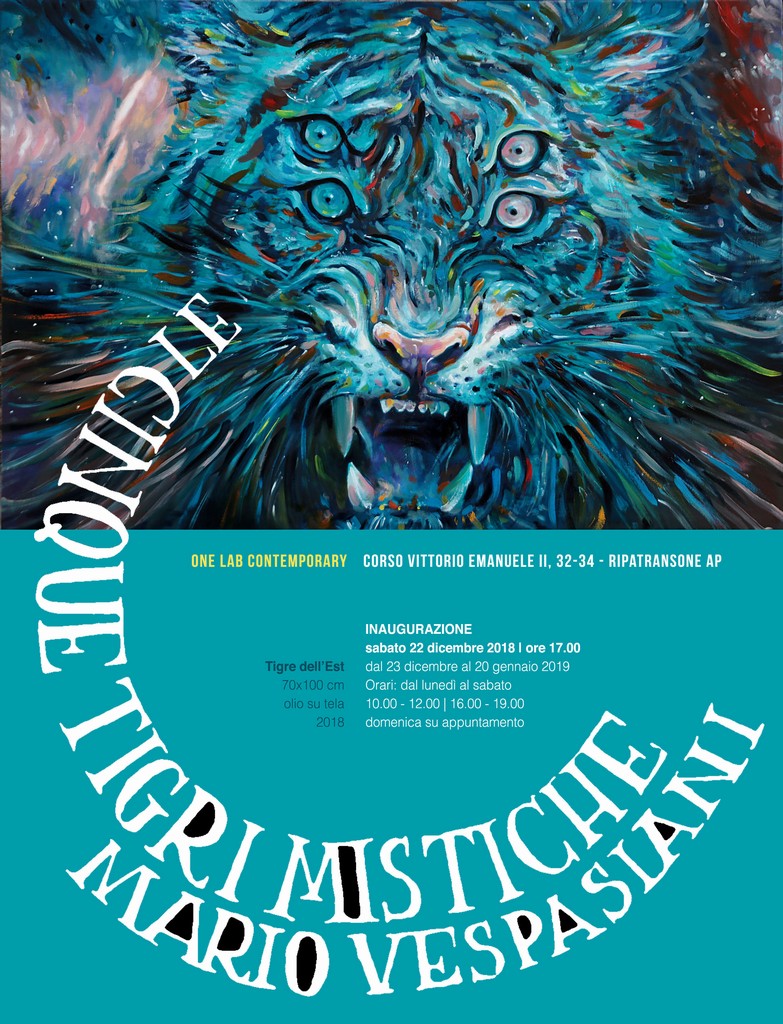 Le cinque tigri mistiche sono dunque un archetipo che ha in sé il sacro da cui distogliere lo sguardo e la fascinazione per l'abisso, dove lasciarsi attrarre nella vertigine di una dimensione non ancora conosciuta. Mario Vespasiani interpreta così, con la grinta che lo contraddistingue un tema che ha da sempre appassionato i grandi maestri dell'arte sia orientale - la tigre di Rosetsu del 1786 è considerata una delle opere più celebri del Giappone, preziose sono quelle riprodotte sui tappeti tibetani, mentre dall'eta del bronzo risalgono quelle coreane - che occidentale, da Delacroix a Rubens a Rousseau fino a Dalì, ultimo erede di una conoscenza che ha viaggiato per secoli e che assume nuova pelle nella ricerca di Vespasiani.