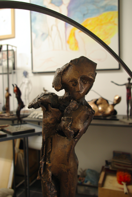 Metallo che sembra argilla per quanto appare duttile e leggero, aperto allo sguardo, in figure dai contorni definiti, ma cave all’interno; forme che dialogano tra loro e con lo spettatore, a suggerire, più che ad affermare, la verità di uno spirito cristallino che riflette sugli accadimenti della vita e della società: l’amore, il dolore, la perdita, la solitudine, la forza la determinazione, l’emigrazione, l’emarginazione, la guerra, il coraggio e la paura di solcare mari sconosciuti e navigare verso l’ignoto.