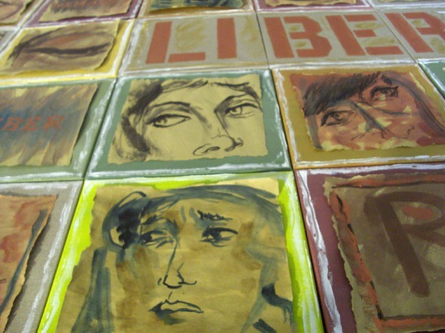 l’altra, dal titolo “liber”, si compone di 100 carte che ritraggono tanti volti e tanti sguardi della coraggiosa icona femminile. Una donna la cui vita è stata sempre innervata all’insegna della libertà. Ha creduto nella libertà,ha lottato per la libertà, è stata la bandiera della libertà perfino in tempi oggi un po’ disperati. Marisa Settembrini ne ha dissotterrato lo spirito della scrittrice, e certe icone collage, sottili radiografie della sua storia di nomade toscana, sono un testimonial curioso e scintillante. E quella vita anarchica della giornalista,presa tra pace e guerra e tra guerra e pace, fino alla profezia degli ultimi anni che ha tentato di esorcizzare il presente, tutto si affaccia in queste pagine di colore della Settembrini, che ridanno tono a certe verità, e in cui persistono intenzioni e tentazioni di riamare la vita. Collage,segni e scritture, macchie e fondali di colore monocromo, si disfano in una luce, in una strategica ansia di disvelamento dell’attimo, in miraggi inseguiti da osservatori differenti. La vita riaffiora in finestre istoriate,e l’artista ci consegna ormai una irresistibile verità,porgendoci di ogni immagine il suo centro.Questo suo nuovo interrogarsi in arte è come dar vita a una fenomenologia post-storica,di arte relazionale che in questo caso abbandona il sublime ed esplora ,saccheggiando, come un puzzle, una mappa topografica dell’intralinguistico teatro del mondo. Persino “la colonna di Borges” , una stele concava-convessa , ci racconta poi la storia della cultura occidentale.