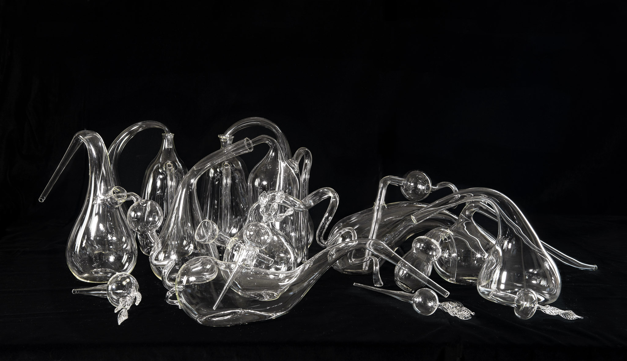 una accumulazione di vetri soffiati e ceramiche ad ingobbio dedicati agli strumenti alchemici visionariamente reinventati