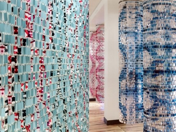 Le sue installazioni sono veri e propri mosaici contemporanei che prendono forma ispirandosi ai principi archimedici di circoli e triangoli, un’intelaiatura esagonale che produce pentagoni; forme geometriche che divengono forme fluide. Architettura e tessuto si condizionano a vicenda in relazione alla compressione ed espansione dello spazio nel tempo, in un gioco ipnotico in cui la geometria viene utilizzata come mezzo espressivo e strumento di percezione.
