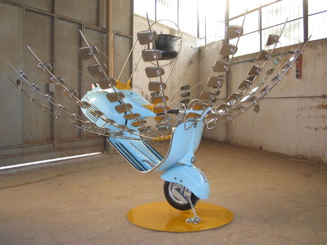 L’installazione “Shivavespa”, nella prima stanza della galleria, è composta da una vespa del ’63 su cui l’artista ha fissato, nella forma di un ventaglio, una serie di barre di acciaio inossidabile con degli specchietti retrovisori di scooter inglesi. I raggi solari, raccolti dagli specchietti, riflettono il calore ad una pentola che permette di cucinare dei cibi.