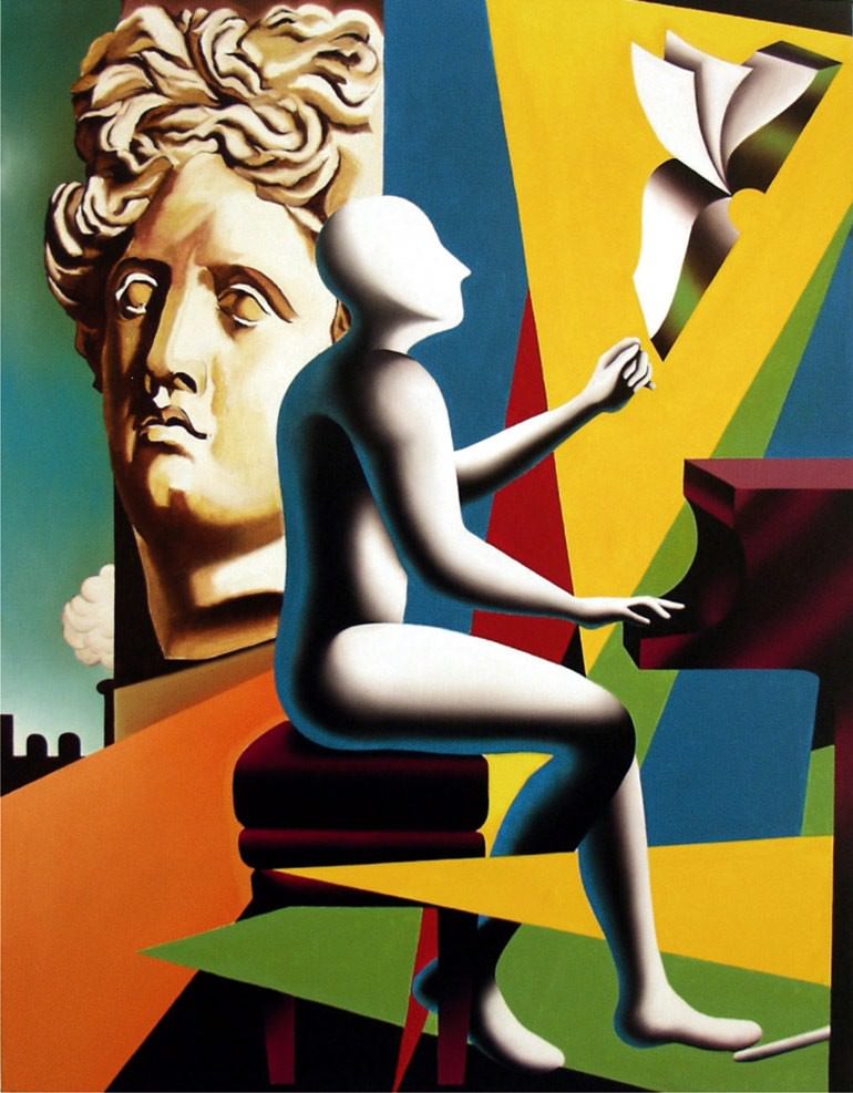 Il tema della musica e della letteratura (durante l’esposizione vi saranno testi e libri legati all’arte moderna e contemporanea) è stato ideato da Giorgio Ferrarin e Mark Kostabi appositamente per questa mostra. “Entrambi sono linguaggi differenti – sottolinea l’artista - ma nel contempo molto simili e tutti appartengono al mondo dell’arte. Non per niente in alcuni di questi quadri riproduco il pianista assieme ad un libro che è il simbolo della conoscenza. Per me l’arte e la conoscenza sono alimenti per il nostro spirito e non possiamo farne a meno”.