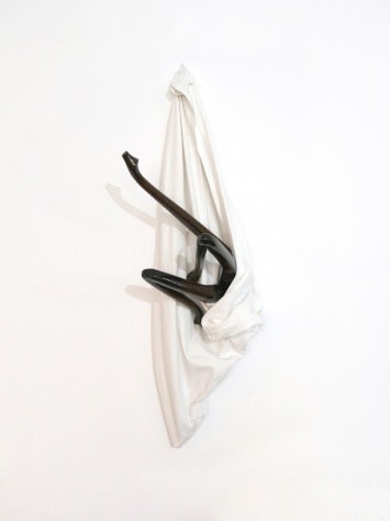 In his sculptural practice Schinwald has always been interested in the manipulation of pieces of furniture. He often uses Biedermeier table or chair legs, characteristic of a 19th-Century style. He saws them off and rearranges them in uncanny ways that bring out their anthropomorphic qualities. The half-hidden wooden parts stretch the fabric, which is reminiscent of the white cloth that is used to cover and protect furniture, thus creating weird and sexually allusive forms. The stretched fabric acts as both sling and cocoon, concealing joints and limbs that struggle as much as they acquiesce.