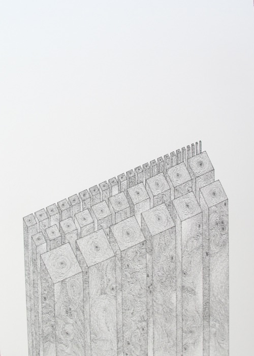 La scultura dal titolo National Question consiste in due bandiere, una dell’Italia e una dell’Unione Europea, intrappolate nella loro posizione da un blocco di cemento. L’incapacità di queste bandiere di distendersi completamente e sventolare e il confronto fra il Paese e la sua Comunità, sollevano questioni sul difficile momento in cui viviamo, il nazionalismo, la crisi e la difficoltà di esercitare la sovranità senza chiudere le porte ai paesi vicini. La seconda parte della mostra è un gruppo di disegni inchiostro su carta in cui l’artista ha usato sagome architettoniche per trasformarle in serie di edifici, ricordandoci le costruzioni dei quartieri, specialmente quelli dei regimi autoritari.