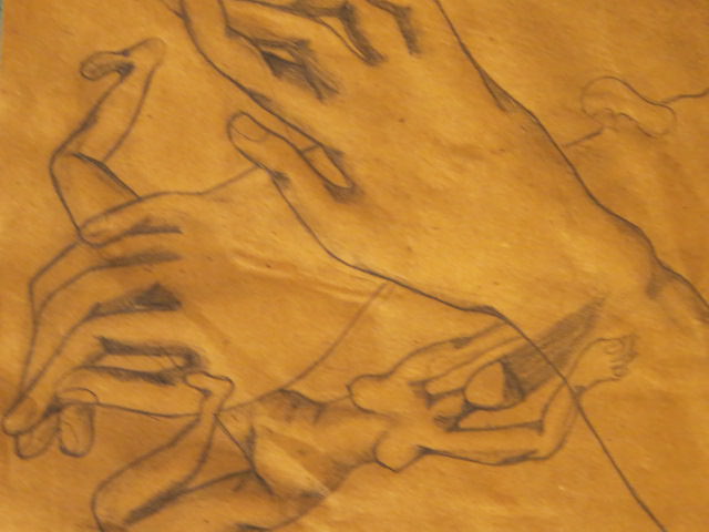 e di profilo- con un segno che non si distoglie dal foglio se non per passare ad un altro. Il vastissimo corpo dei suoi disegni, che si direbbe frutto di una pratica implacabile, una specie di scrittura automatica sui generis, compone una parata di maschere e personaggi che si presentano anche nella sua opera letteraria e nelle fragili sculture, leggere e “portatili”. Anch'esse derivano per lo più dai fogli A4 ritagliati in sagome riempite di colore