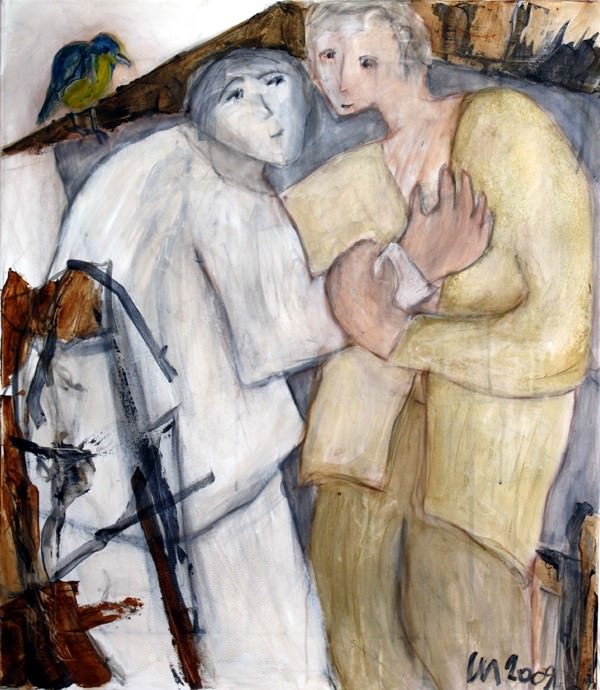 …Viaggiare sulla tela o viaggiare intorno al mondo desta in Martha lo stesso sentimento di stupore. Ecco spiegata, forse, la meraviglia che emanano i volti dei suoi personaggi trasognanti, melanconici ed interroganti. All’immaterialità degli sguardi si contrappone la gestualità espressiva di grandi mani da homo faber che più d’ogni discorso ci dicono qualcosa sul valore che per l’artista assume il fare. Un fare, il suo, mentale ed artigianale, nel quale si identificano arte, vita e procedimento pittorico. Libera dalle logore e sterili categorie oppositive (astratto-figurativo, avanguardia-postavanguardia, moderno-postmoderno), attraverso la sua pittura-poesia, Martha dischiude al nostro sguardo il suo abbraccio verso il mondo e l’opera intesa come luogo dell’anima e ci indica, infine, la possibilità di equilibrio tra sentire, pensare e fare l’arte, oltre l’aporìa postmoderna.