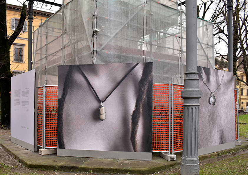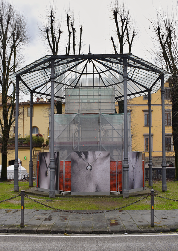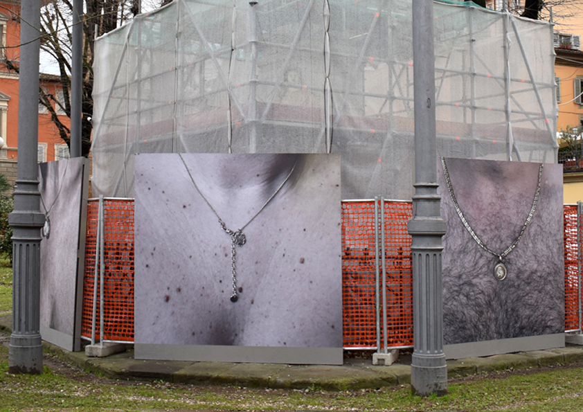 Bijou è un’installazione site specific inserita nel contesto urbano, le immagini fotografiche mostrano una dimensione intima che si collega a linguaggi sociali ed antropologici, si impongono allo sguardo dei passanti i quali ne attribuiscono un loro senso, aprendo lo spazio privato a quello pubblico