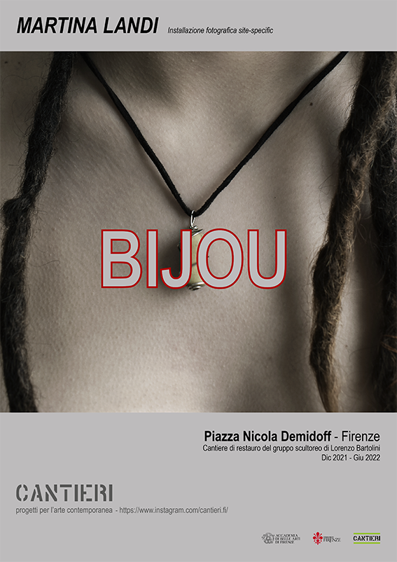 L'opera intitolata Bijou è un installazione fotografica di Martina Landi, che riflette sulla relazione tra individuo e società : le immagini sono "ritratti" di realtà quotidiana, dettagli di una mappatura corporale in cui il bijou si inserisce, diventando un elemento di congiunzione e narrazione di sentimenti ed esperienze che ci connettono a simboli, affetti, legami e comunità. In questa visione il bijou è un oggetto minimo, "leggero", portato con disinvoltura ma che svelato si fa testimone di un linguaggio sociale ed antropologico. Se, come sosteneva Paul Valery, "la profondità dell'uomo è la sua pelle", l'impatto visivo del corpo può farci accedere a una dimensione esperenziale comunitaria, in cui la carne è sempre anche relazionale e rimando a un sostrato di esistenza comune. Ciò che si raggiunge non è però la naturalità, bensì una complessa mediazione tra corpo, individuo, comunità e cultura, in cui l'oggetto, apparentemente inerte, gioca il ruolo di crocevia.
