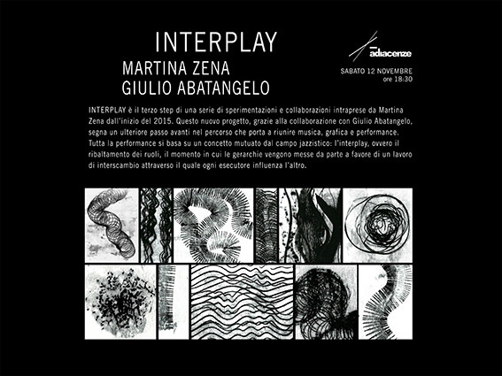 INTERPLAY è il terzo step di una serie di sperimentazioni e collaborazioni intraprese da Martina Zena dall’inizio del 2015. Questo nuovo progetto, grazie alla collaborazione con Giulio Abatangelo, segna un ulteriore passo avanti nel percorso che porta a riunire musica, grafica e performance.