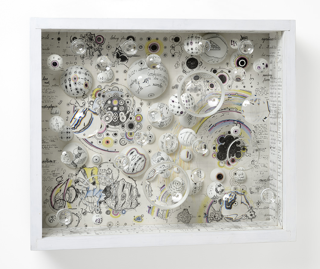 Bauermeister interpreta la vita circoscrivendola nella multidimensionalità della box (scatola), che in questo caso diventa una thinking-case, con le tracce dei suoi pensieri, sia scritti che disegnati, velati e scombinati da diversi strati di vetro.