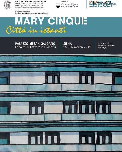 Martedì 15 marzo alle ore 18,30, sarà inaugurata nel chiostro del Palazzo di San Galgano, sede della Facoltà di Lettere e Filosofia dell’Università di Siena, la mostra dell’artista Mary Cinque che per l’occasione ha realizzato un’installazione dal titolo Città in istanti. L’esposizione è il quinto appuntamento del nuovo ciclo, che ci accompagnerà fino ad aprile 2011, della rassegna SANGALGANOSQUARE, curata dal Prof. Massimo Bignardi e organizzata dalla Cattedra di Storia dell’Arte Contemporanea del corso di Laurea Specialistica in Storia dell’Arte; una iniziativa sostenuta dal Preside della Facoltà di Lettere e Filosofia, il Prof. Roberto Venuti e che si avvale del patrocinio del Comune di Siena, nell’ambito del programma promosso dall’Assessore alla Cultura Prof. Marcello Flores d’Arcais.