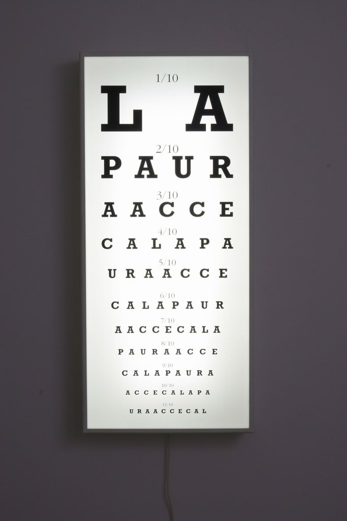 Nel piano interrato nove light box dal titolo Test optometrico riportano citazioni inerenti la tematica della percezione visiva. La grandezza dei caratteri segue il criterio dei test optometrici per la misurazione della vista, il progressivo rimpicciolire delle lettere pone lo spettatore di fronte ai propri limiti visivi. Nel buio della sala una voce viene in aiuto al visitatore, non solamente non vedente, guidandone l’orientamento spaziale.