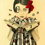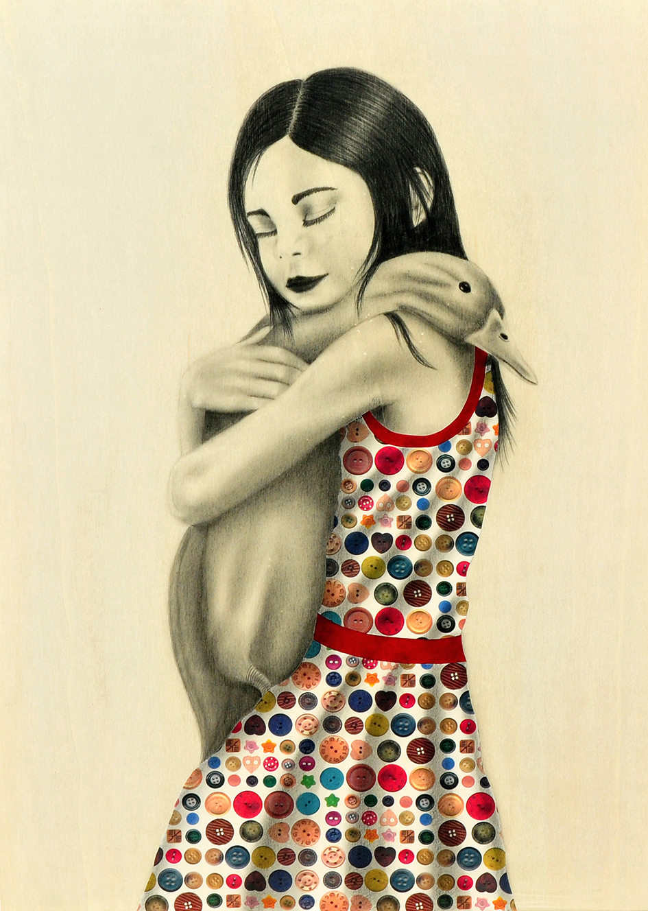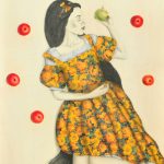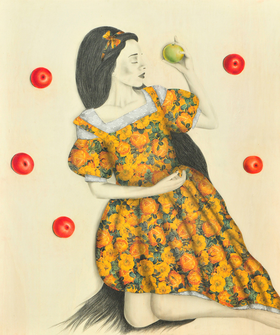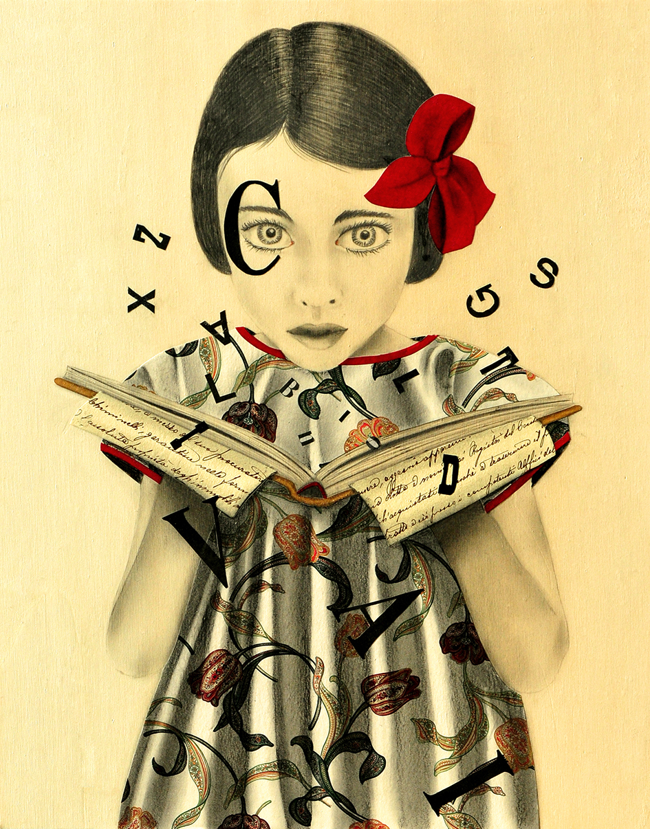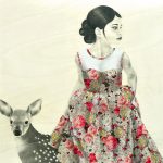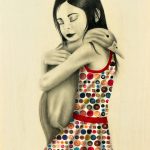 “L’artista, con le sue opere, ci chiede di seguirla per raggiungere una dimensione metafisica. Lo fa mettendo a punto una sua peculiare tecnica: grafite e collage su tavola di legno con l’aggiunta, in alcune rappresentazioni, di acrilico e foglia oro per lo sfondo, come di altre tonalità. Una tecnica complessa, per l’oggettiva difficoltà di realizzazione. Le figure femminili e gli animali che spesso le affiancano emergono dalla tavola ascetiche e raccolte in se stesse, sono come fiori primordiali che si aprono alla vista dello spettatore con esplosioni di colori. Figura femminile, animali, oggetti e inflorescenze dal mondo vegetale germinano dal subconscio e rimangono sospesi come un pensiero siderale e scultoreo. Nonostante la precisione descrittiva dell’atto artistico, esso rimane fondamentalmente un mistero. Per dirla con Proust: «Gli atti creativi procedono, infatti, non dalla conoscenza delle loro leggi, ma da una potenza oscura e incomprensibile, che non rafforziamo illuminandola. […] Un quadro è una specie di apparizione d’un cantuccio d’un mondo misterioso, di cui conosciamo alcuni altri frammenti, che sono i quadri dello stesso artista» (M. Proust, Pittori, Abscondita).”.