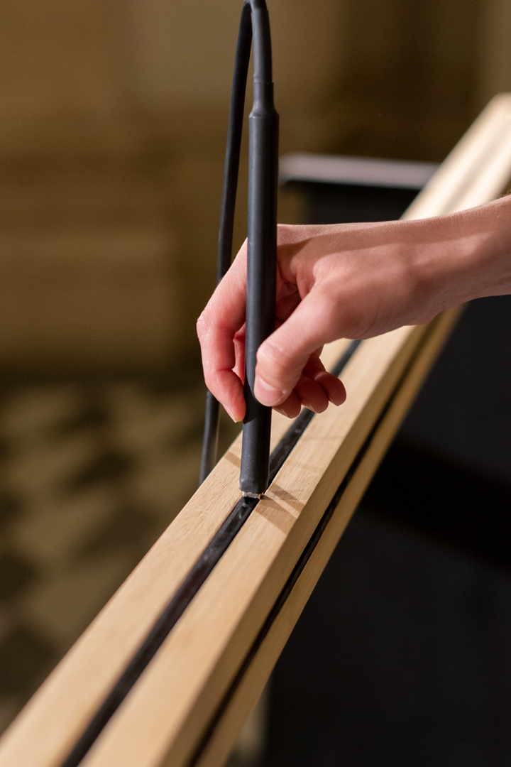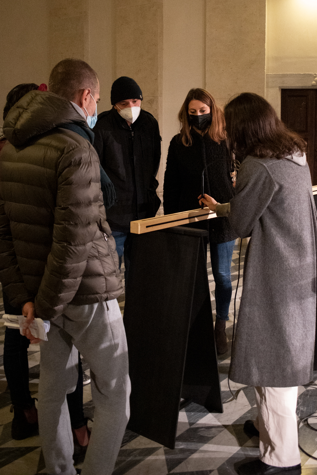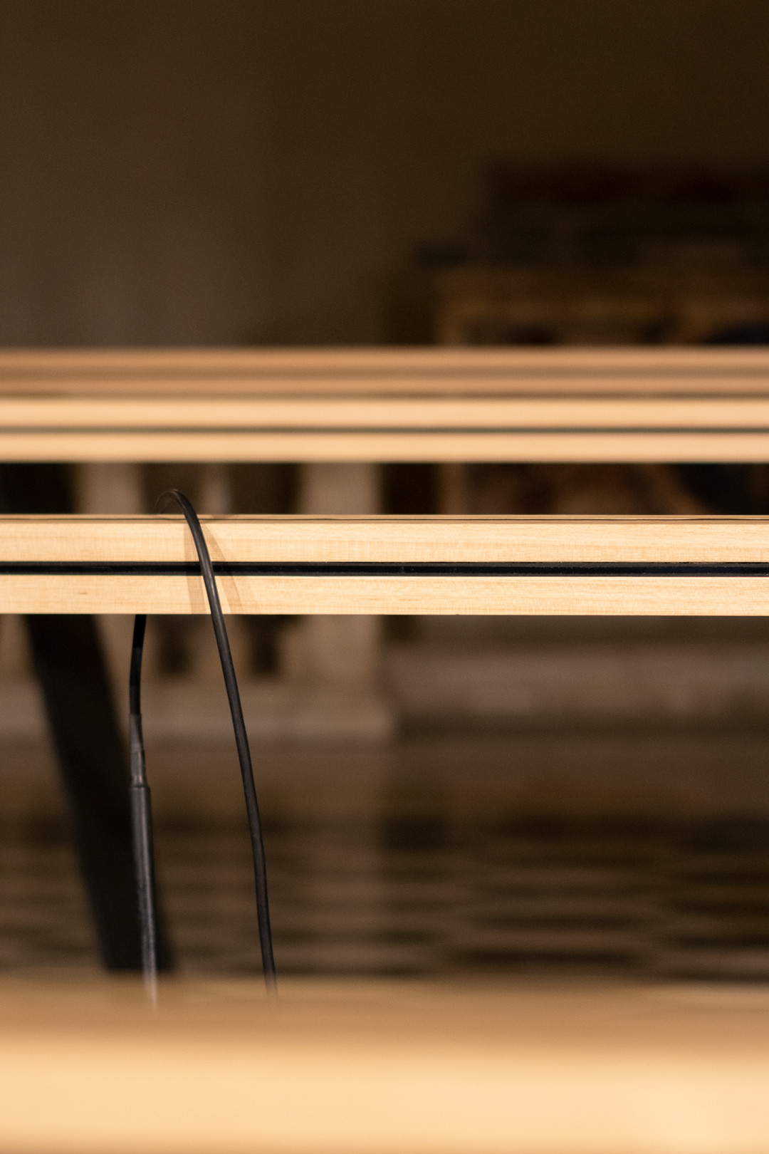 Biblioteca è un’installazione sonora e partecipativa intesa come un’investigazione sulla scrittura e sul valore comunitario di cui è portatrice. L’opera consiste in una serie di barre di legno dotate di quattro nastri magnetici per ogni lato inseriti in una fenditura all’interno del supporto ligneo, accompagnate da uno “stilo” per la lettura e un sistema di amplificazione che restituisce nello spazio i contenuti sonori. Le barre possono essere utilizzate contemporaneamente da più persone: l’atto interpretativo dell'individuo si fonde con quello collettivo, creando un coro di voci e consonanze sonore e trasformando l’ambiente circostante in una contemporanea torre di Babele caduta. I contenuti delle barre di legno si manifestano attraverso il gesto dei singoli, la cui andatura, senso e velocità rivelano il testo inciso in suoni sovrapposti, distorti e sempre mutevoli. L’atto della lettura diviene così un’azione totalmente attiva, una ricerca cosciente di un mondo di alternative finite che a ogni lettura risultano diverse e reinterpretabili in un continuo lavoro ermeneutico. Numerose sono le tracce incise, due i sensi di lettura, infinite le possibilità di interpretazione.