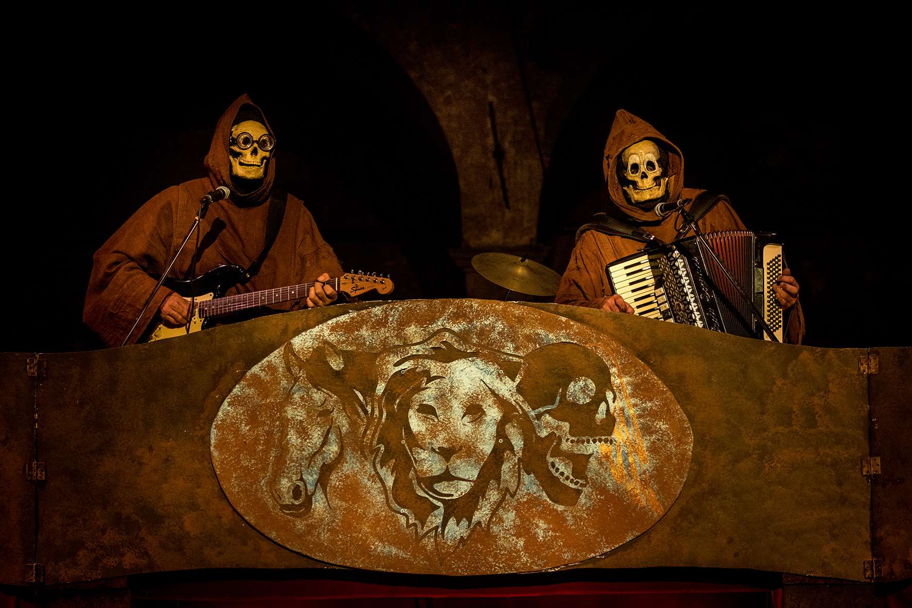 Lo spettacolo mette in scena sei clown mascherati, sei monaci-scheletro, che si riuniscono, insieme ad angeli, leoni e cavalli, per fare della morte un circo surreale. È un circo dell’anima, mescolanza di malinconia, riso, paura della morte e nostalgia, una dichiarazione d’amore ai mitici clown del passato, da Foottit et Chocolat ai Fratellini, al grande Charlie Rivel, ai Fratelli Colombaioni.