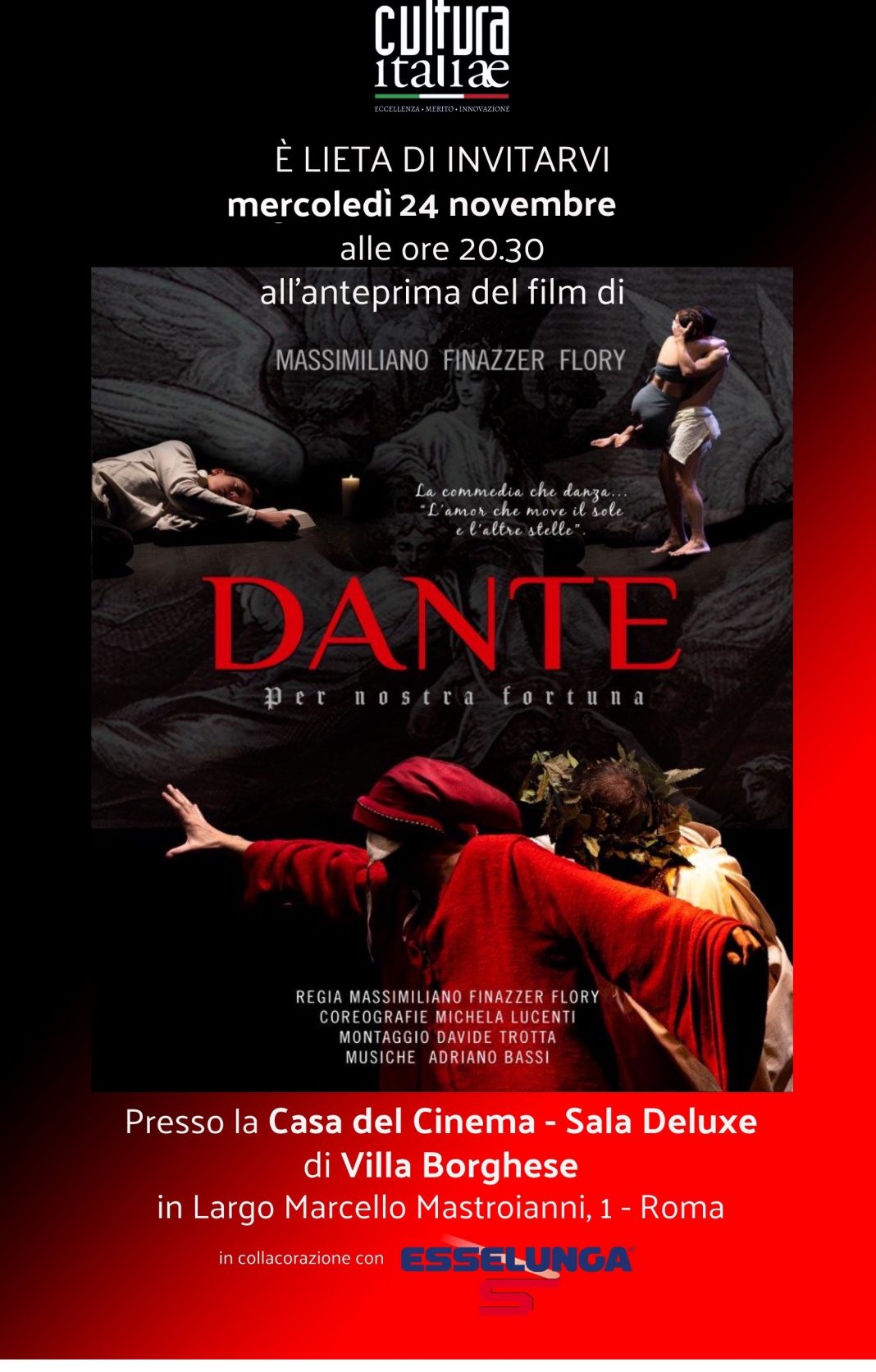 In occasione della chiusura dell’anno in memoria del settecentesimo anniversario della morte di Dante, mercoledì 24 novembre alle ore 20.30, la Casa del Cinema di Roma presenta in anteprima “Dante, per nostra fortuna” il film di Massimiliano Finazzer Flory. L’evento realizzato in collaborazione con Cultura Italiae sarà introdotto dal regista e autore Finazzer Flory, con un saluto del Professore Alessandro Masi, Segretario Generale della Società Dante Alighieri. Questa romana sarà la prima tappa di presentazione del film, realizzata in collaborazione con Esselunga, che da gennaio coinvolgerà i cinema d’essai nelle principali città italiane.