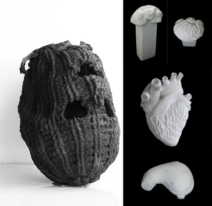“Quando è buio si sta in casa” non è solo la mostra qui presentata, un insieme di oggetti , di cose, solo in parte sufficienti a raccontare della totale ed eterogenea (soprattutto nei termini linguistico - formali) produzione dell'artista: la mirabile perizia tecnica delle sculture in marmo, fedeli riproduzioni di organi interni (Untitled, “heart”, 2010 o Untitled, “stomach”, 2010), fusioni in bronzo di vecchi cappelli di lana resi vacuo sembiante d'orrore (fuori) e demonico smile (dentro), come due inesorabili facce della stessa medaglia (David headless, 2011) o quel moderno Vaso di Pandora la cui entrata divelta, qui dunque dal contenuto già liberato, è piantonata da sedicenti mosche-sentinelle (Untitled “Hole”, 2011)