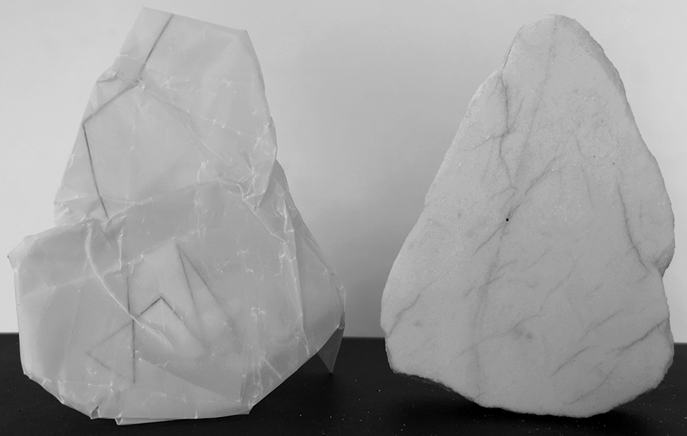 Massimiliano's second series included in the exhibition is also linked to signs. In the works, he unrolls a long sheet of glossy paper ‘au plein air’ in abandoned quarries, letting the paper be moved freely by the wind, a drawing is created at the mercy of the weather—with abrasions, cracks, and creases. The work produced becomes an involuntary performance and the paper begins to look like the marble and the environment that surrounds it, with very few graphic signs made by the artist's hand.