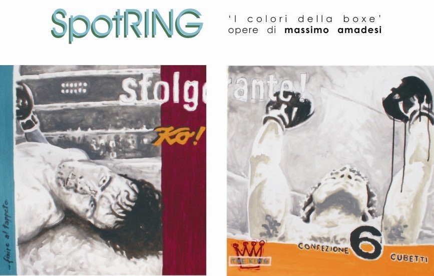 “Ero adolescente quando io e mio padre ci alzavamo in piena notte per vedere Cassius Clay o Nino Benvenuti combattere sul ring. Quelle immagini sbiadite in bianco e nero che uscivano dal nostro piccolo televisore mi trasmettevano tutta l’intensità, la potenza e la suspence di una lotta senza uguali. Il tutto accompagnato prima e dopo da qualche spot pubblicitario: Campari, Brodo Star, Cynar...”. I loghi pubblicitari di allora colpirono subito l’artista per la loro grafica indimenticabile, è così che ci racconta Massimo Amadesi. E’ da qui che nasce il suo progetto “SpotRING”: una mostra di pittura dove il mondo della boxe e quello della “reclame” pubblicitaria si fondono arricchendosi.