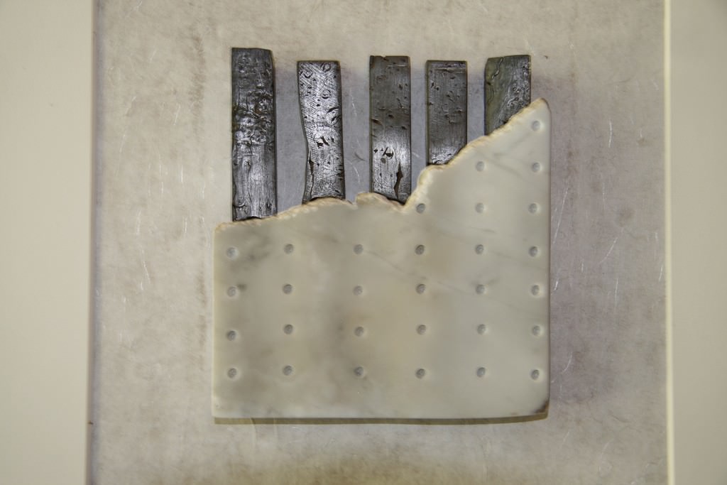 Marmo di Carrara, ardesia, granito del Labrador, legni, grafite, carta giapponese, carta nepalese, carta oleata… niente è posto a caso o solo per un gusto estetico, ogni materiale è conosciuto con sapienza tecnica e scelto per la sua funzione originaria, posta in correlazione con la situazione che ha fatto accadere l’opera nel corso del tempo.