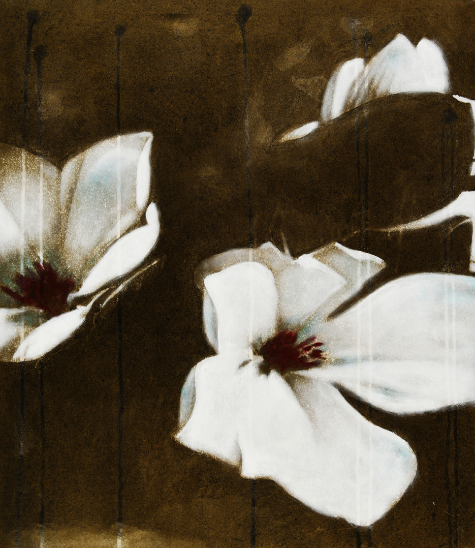 Circa 20 le opere esposte, principalmente con tecnica acrilico su tela: petali, eteree ali di farfalle, steli e foglie strappati dal tempo, raffinate simmetrie, contrappunti silenziosi tra l’essere e lo svanire.