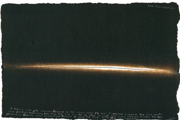 pagina,rendendolo tridimensionale. “Come in una scultura non abbiamo a che fare con un piano , ma con un corpo” (L. Cherubini). Nei punti di incontro o come nel caso di questi ultimi seguendo l’andamento delle pieghe, Bartolini disegna gli alberi o la siepe del suo giardino. Saranno inoltre presentati per la prima volta dei disegni realizzati incidendo con la puntasecca una lastra di plexiglas in cui l’immagine è data dall’ombra che la parte incisa proietta sulla parete. Ultimo risultato di una ricerca che tende a coniugare spazio reale e spazio immaginato.