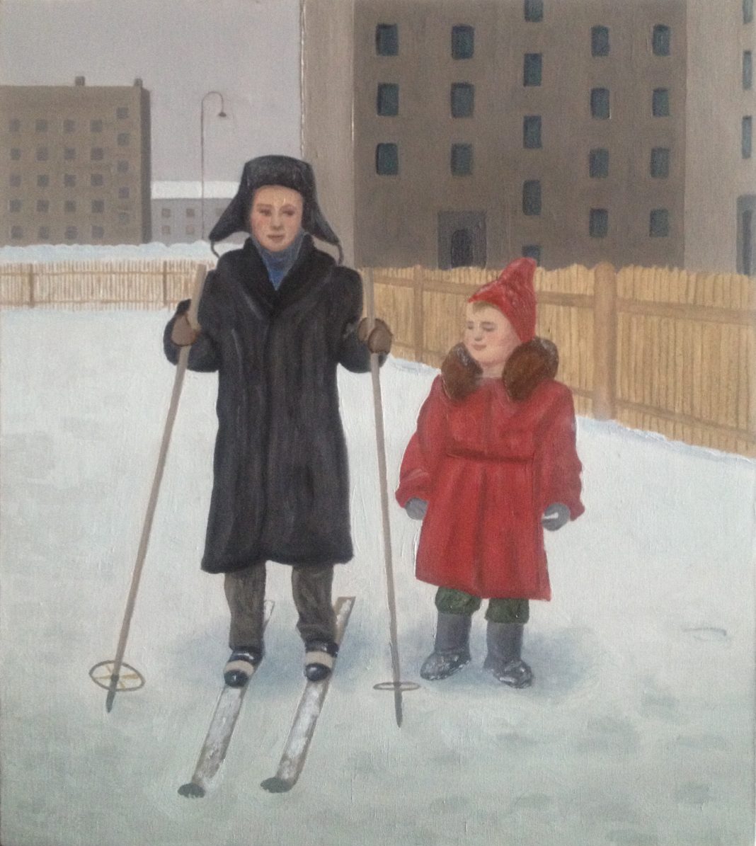 Ecco allora l’artista bambino con il padre nella neve, tram che sfrecciano nel bianco, architetture comuniste squadrate e anonime, gli amici e gli affetti più cari in atmosfere sospese e scenari immobili e incantati. Tutto è essenziale, per un pittore che lavora per sottrazione, con figure dai contorni precisi e ben definiti che si stagliano su sfondi solidi e colorati.
