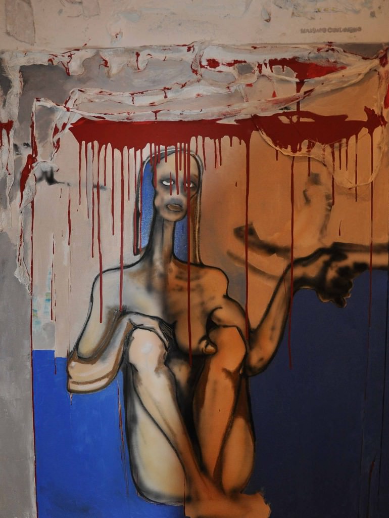 WAR CODE: codice di guerra è un’opera di natura pittorica che consta di una serie di tele-installazione ma aperta e progressiva che si compone di diversi episodi, suscettibili di svariate collocazioni, anche sotto forma di performance. La guerra intesa come ingaggio, combattimento, sofferenza, indifferenza, discriminazione, ingiustizia, retorica, volgarità, superficialità, incompetenza, superbia, sessismo, razzismo, stupidità, negazione, tristezza, banalità, qualunquismo, corruzione, disprezzo.