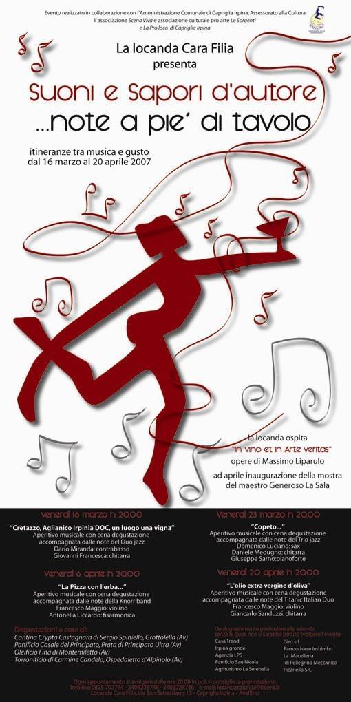 Una locanda alle pendici del Monte Partenio a Capriglia Irpina (AV), dove da un anno ormai le pareti sono offerte ad opere di artisti contemporanei, con cadenza mensile. Le pareti sono quelle della Locanda ‘Cara Filia’, nuovo ristorante glam aperto per coniugare il cibo, il vino e la convivialità alla creatività italiana. L’opera e l’artista sono quelli invitati ogni mese da Filomena De Simone, data la sua passione per l’arte e per la buona cucina irpina. Un ciclo di appuntamenti che sceglie di inaugurare un nuovo modo di degustare l'arte.